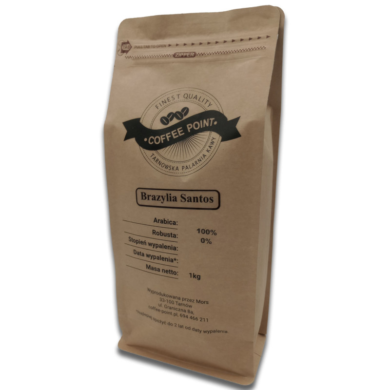 Brazylia Santos to 100% Arabica. Kawa ta cechuje się delikatną goryczką oraz owocowym posmakiem. Kawa jest mocno palona co sprawia, że smak napoju jest intensywny. Dobry balans, niska kwasowość, idealna kawa, która przypadnie do gustu większości osób, delikatnie owocowy zrównoważony smak.