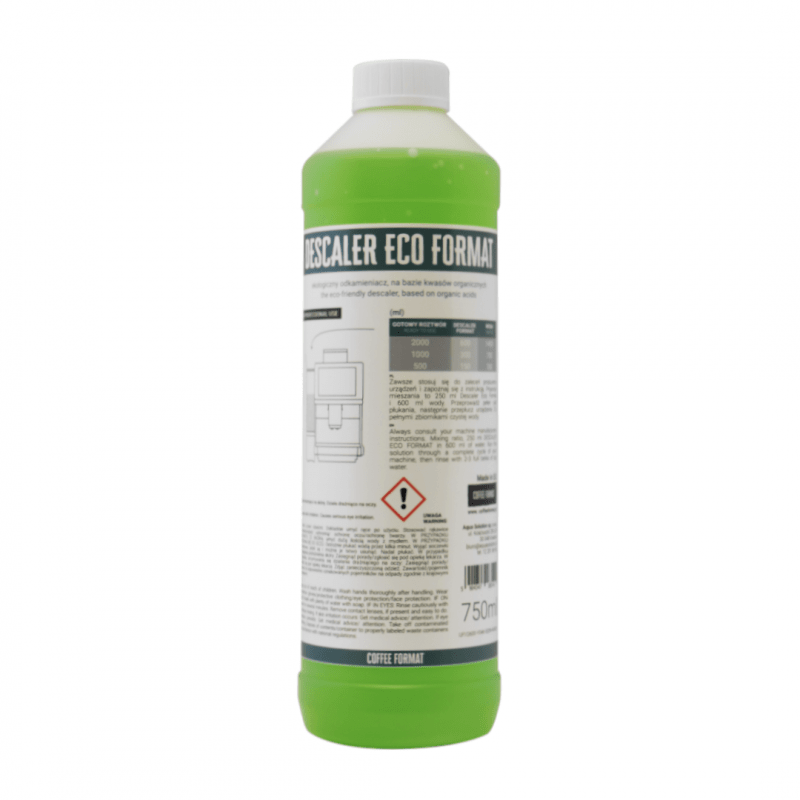 Descaler Eco Format, którego receptura została oparta o kwas cytrynowy, rozpuszcza osad wapienny i kamień, które odkładają się w całym ekspresie. Składniki ekologicznego odkamieniacza nie niszczą urządzenia, a proces odkamieniania znacząco zwiększa żywotność urządzenia. Preparat ma właściwości przeciwbakteryjne. Pojemność: 750 ml.
